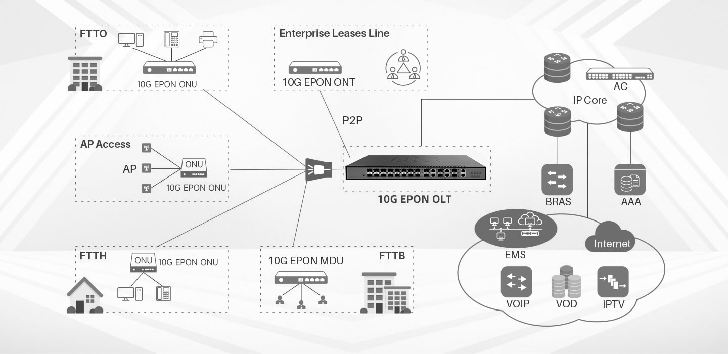 • Metropolitan high-speed optical fiber network networking solution: Since XGS-PON supports long-distance transmission, it can be used to build a metropolitan area network, covering multiple areas within the city to meet urban wide area communication needs.