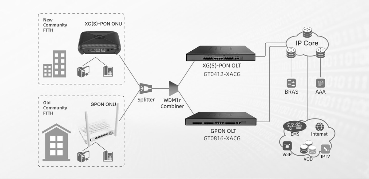 • Supports multiple services: XGS-PON supports multiple services, including high-speed Internet access, video transmission, VoIP (Voice over Internet Protocol), etc., to meet users' needs for different types of services.